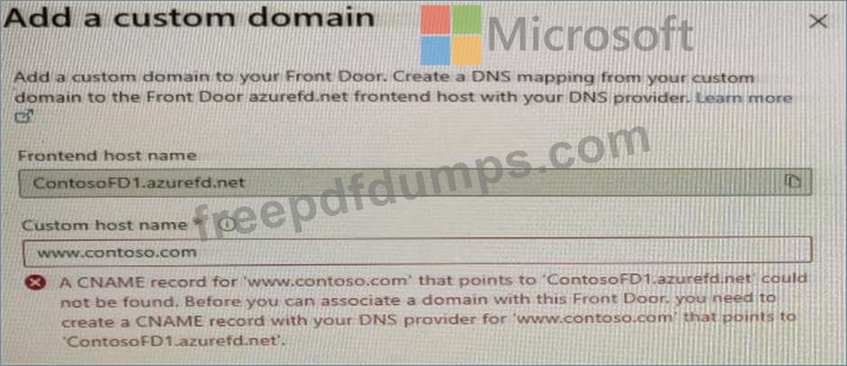 When you attempt to configure a custom domain for www.contoso.com on ContosoFD1, you receive the error message shown in the exhibit.
