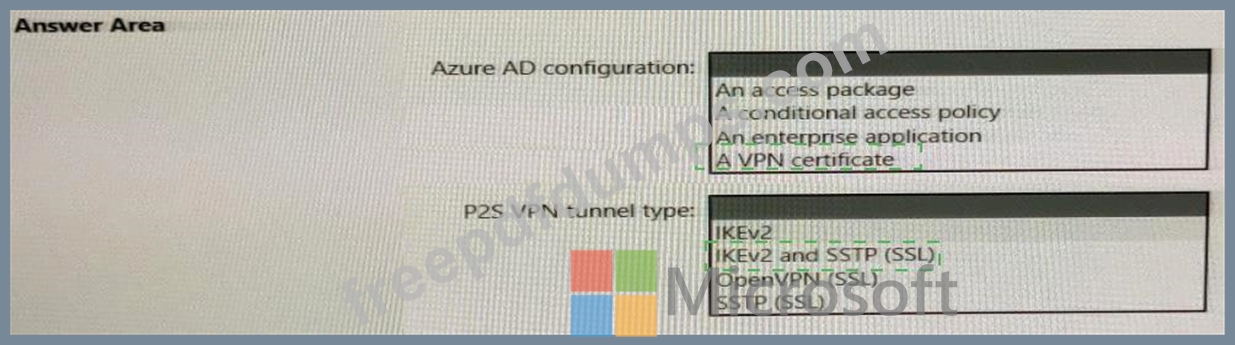 You need to ensure that administrators can use Point-to-Site (P2S) VPN connections to access resources in the virtual network. The connections must be authenticated by Azure Active Directory (Azure AD).