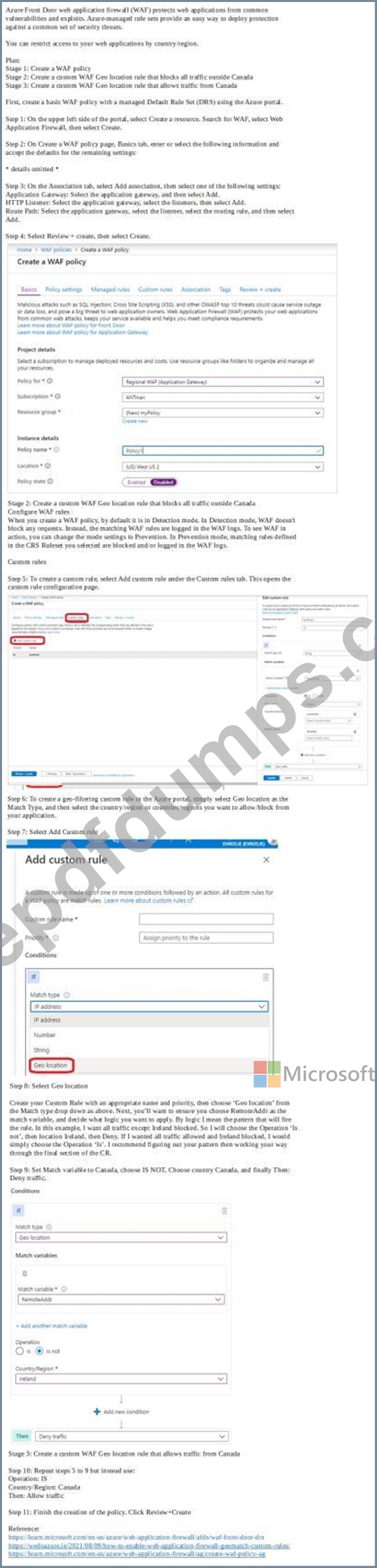 You need to configure a policy that can be used by an Azure application gateway to protect against known web attack vectors. The policy must only allow requests that originate from IP addresses in Canada. You do NOT need to create the application gateway to complete this task.