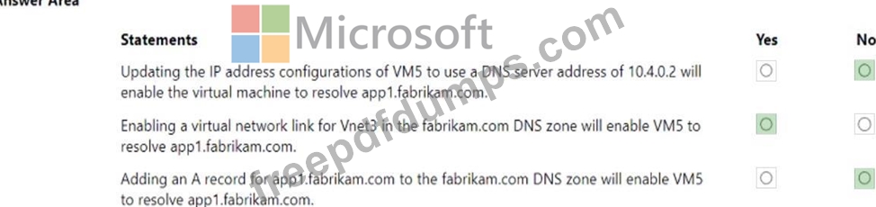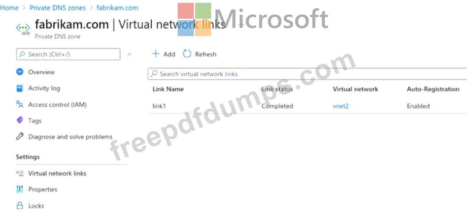 The virtual network links in the fabrikam.com DNS zone are configured as shown in the exhibit.