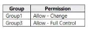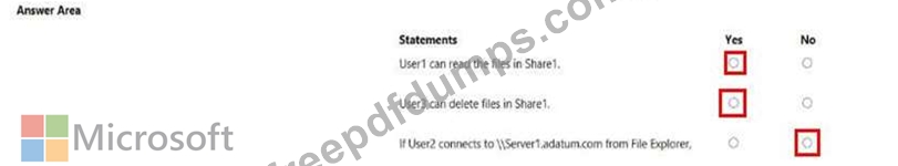 The domain contains a 'He server named Server1 and three users named User1. User2 and User), Server1 contains a shared folder named Share1 tha1 has the following configurations: