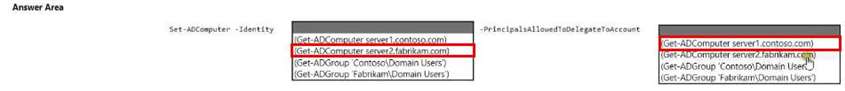 You need to configure resources based constrained delegation so that the users In contoso.com can use Windows Admin Center on Server) to connect to Server? How should you complete the command? To answer, select the appropriate options in the answer are a. NOTE: Each correct selection is worth one point.