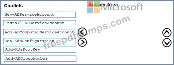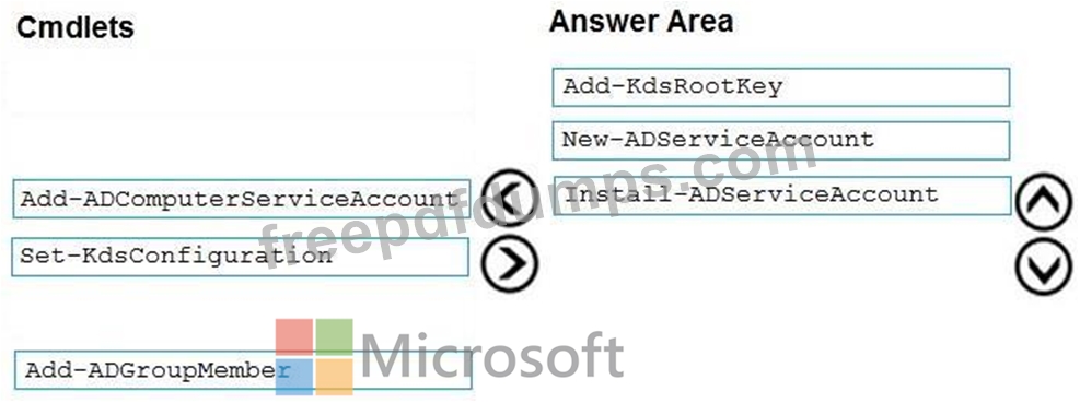 Which three PowerShell cmdlets should you run in sequence? To answer, move the appropriate cmdlets from the list of cmdlets to the answer area and arrange them in the correct order.