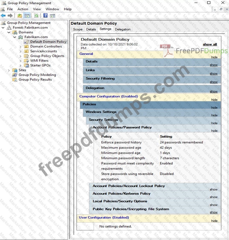 The Default Domain Policy Group Policy Object (GPO) is shown in the GPO exhibit. (Click the GPO tab.)