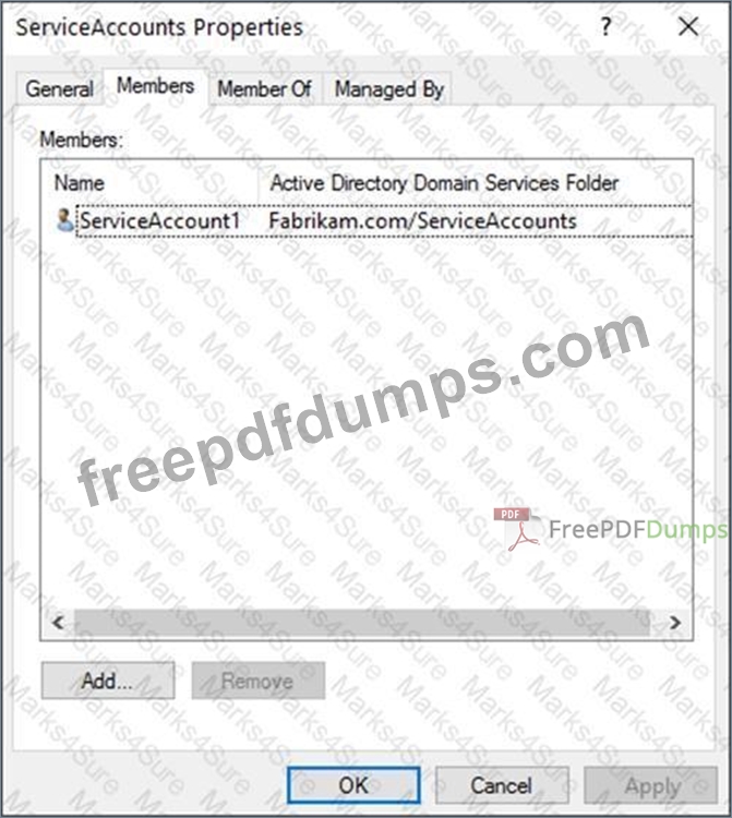 The members of a group named Service Accounts are shown in the Group exhibit. (Click the Group tab.)