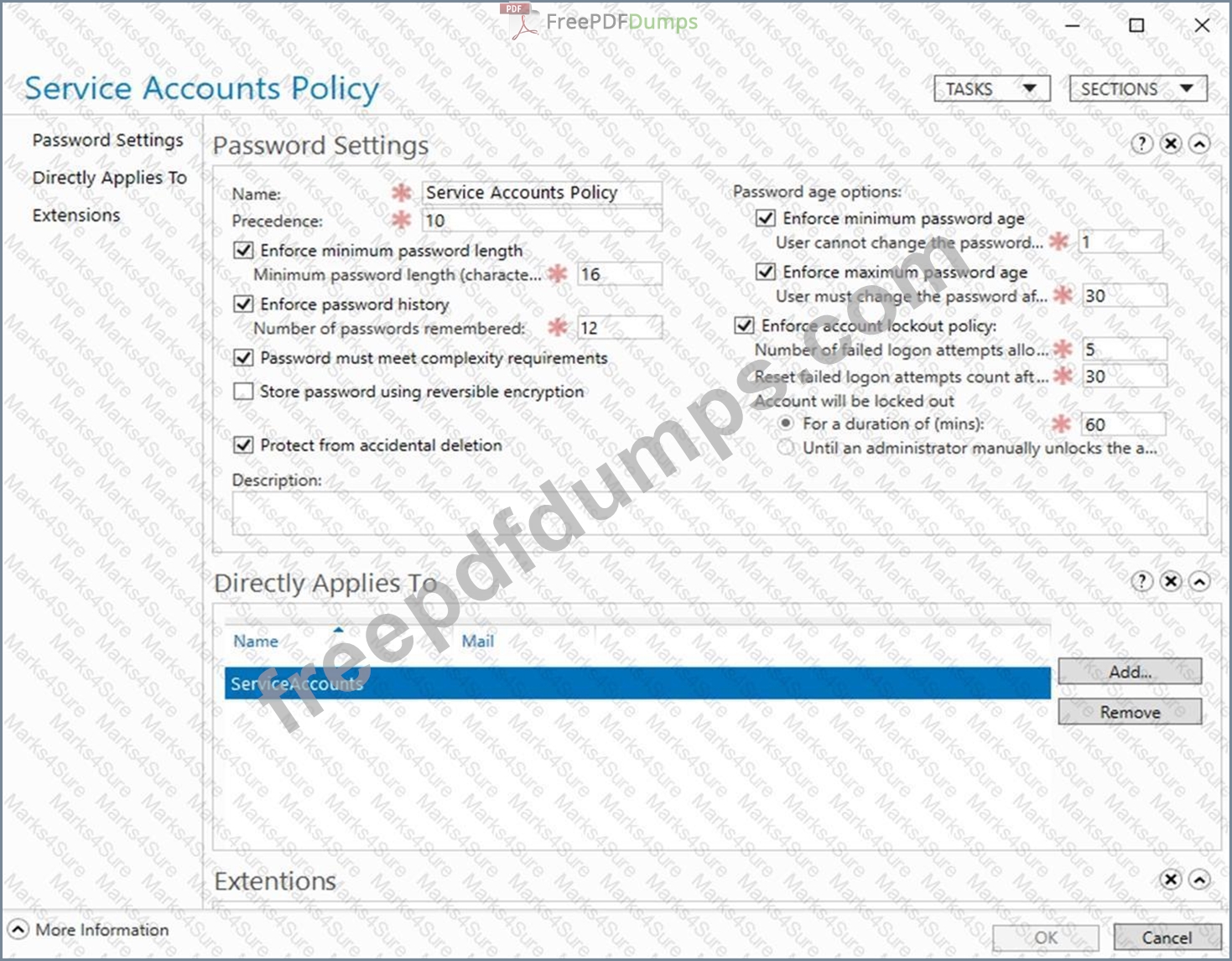 You create a Password Settings Object (PSO) as shown in the PSO exhibit. (Click the PSO tab.)