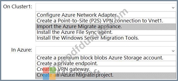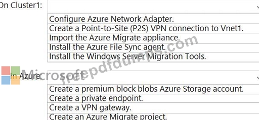 What should you do on Cluster1 and in Azure before you perform the migration? To answer, select the appropriate options in the answer area.