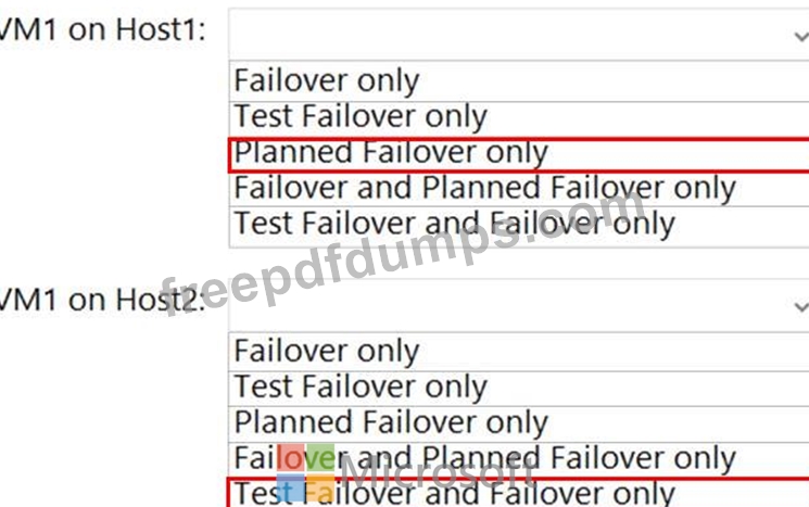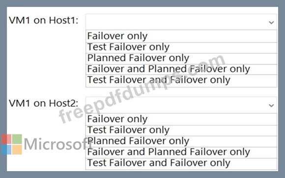 Which types of failovers can you perform on VM1 on each host? To answer, select the appropriate options in the answer area.