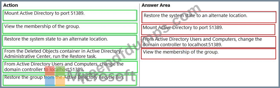 Which four actions should you perform in sequence from a domain controller? To answer, move the appropriate actions from the list of actions to the answer area and arrange them in the correct order.