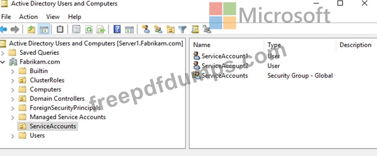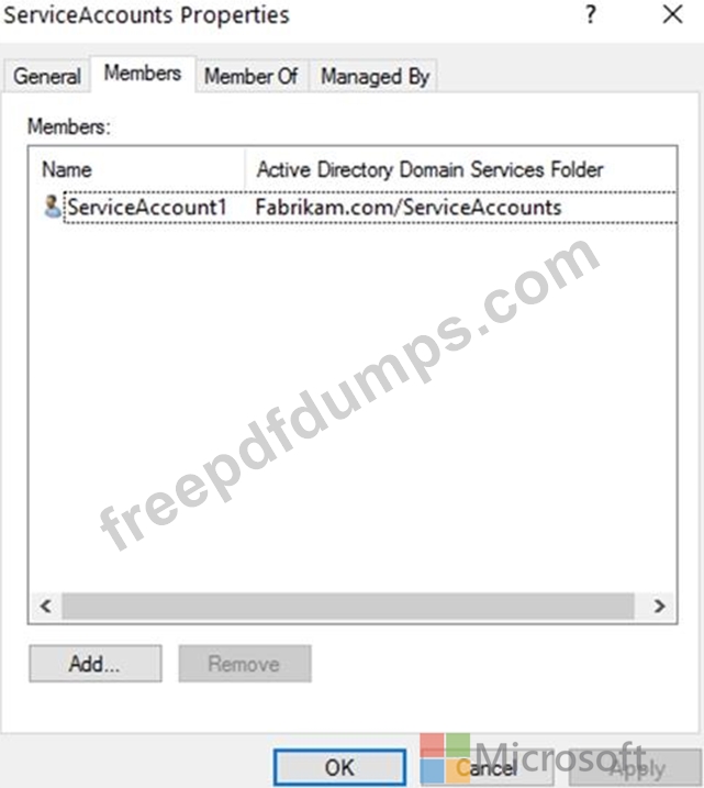 The members of a group named Service Accounts are shown in the Group exhibit. (Click the Group tab.)