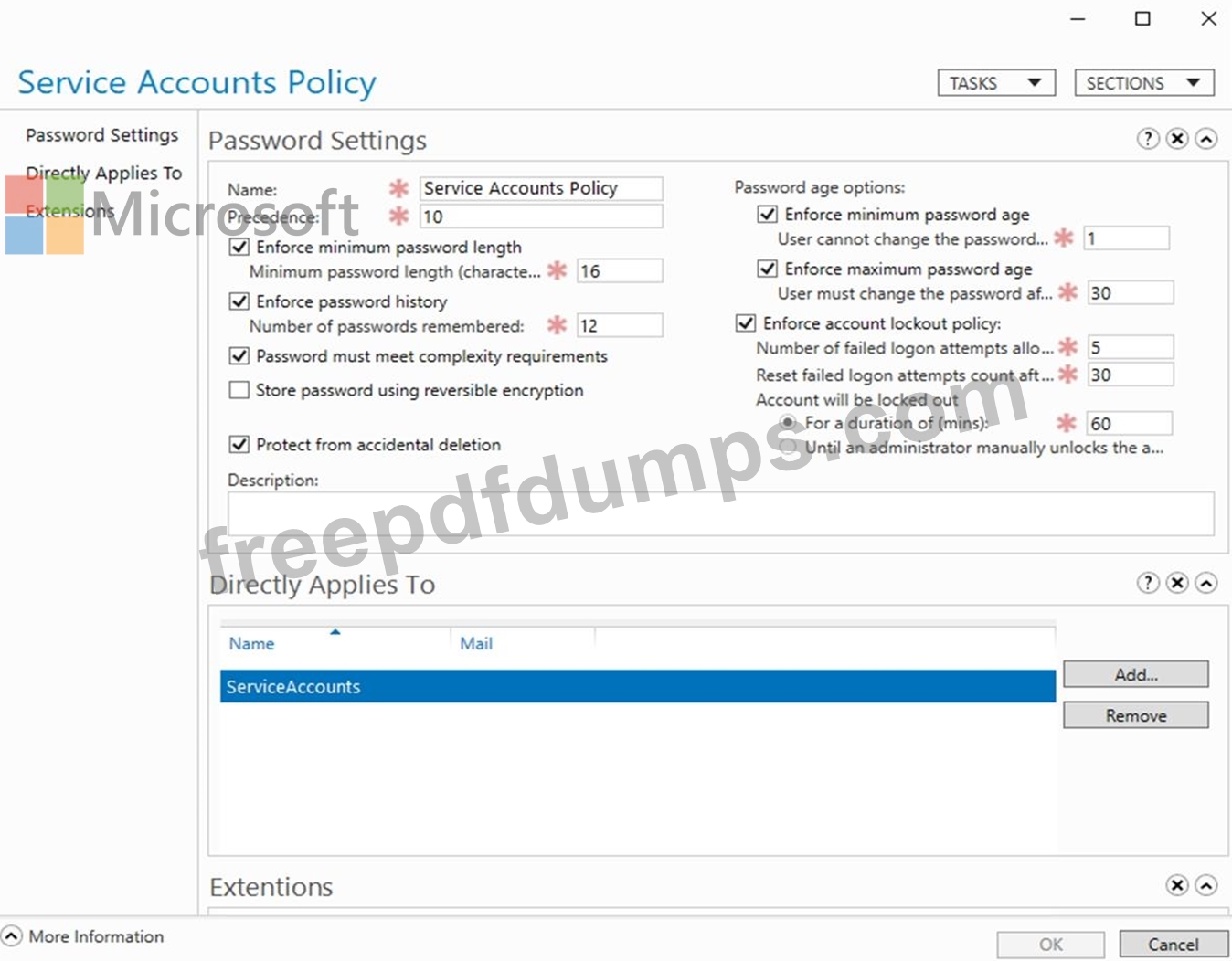 You create a Password Settings Object (PSO) as shown in the PSO exhibit. (Click the PSO tab.)
