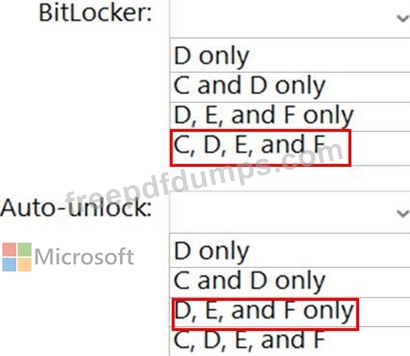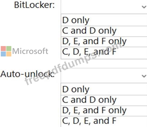 On which volumes can you turn on BitLocker, and on which volumes can you turn on auto-unlock? To answer, select the appropriate options in the answer area.