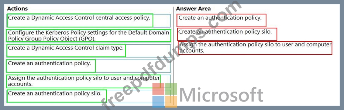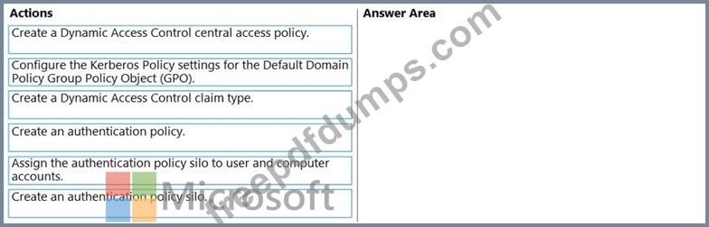 Ensures that the members of the Domain Admins group are allowed to sign in only to domain controllers Ensures that the lifetime of Kerberos Ticket Granting Ticket (TGT) for the members of the Domain Admins group is limited to one hour Which three actions should you perform in sequence? To answer, move the appropriate actions from the list of actions to the answer area and arrange them in the correct order.