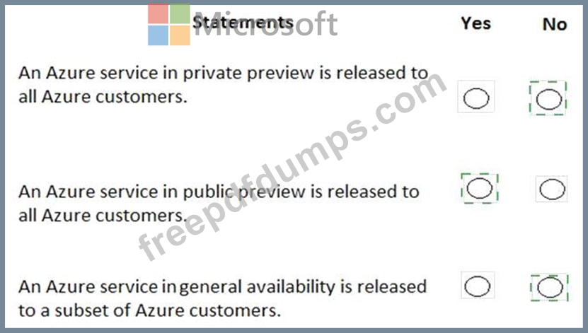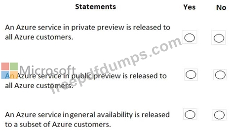 An Azure service is available to all Azure customers when it is in public preview Instructions: Review the underlined text If it makes the statement correct, select "No change is needed." If the statement is incorrect, select the answer choice that makes the statement correct.