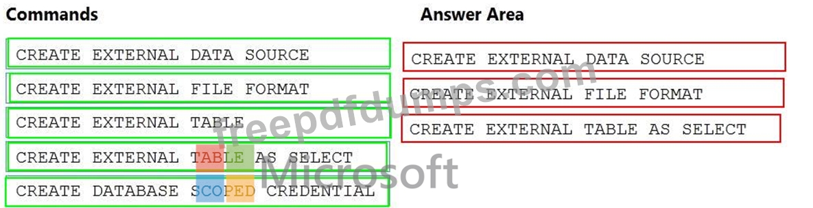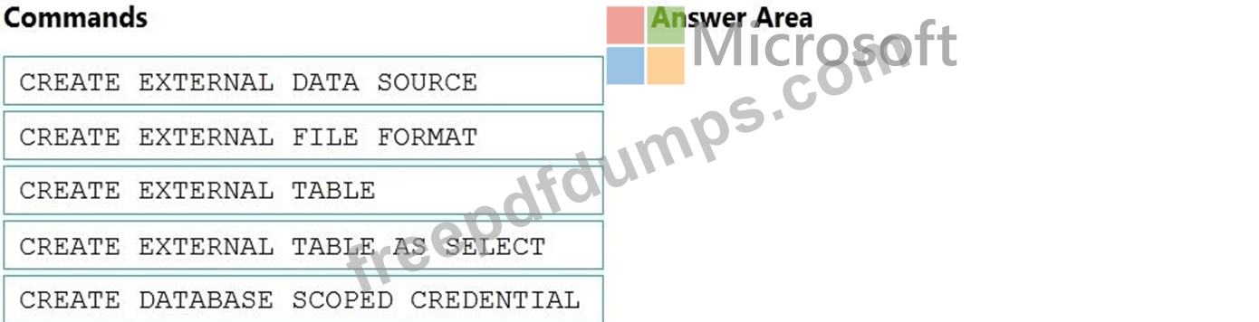 Which three Transaction-SQL DDL commands should you run in sequence? To answer, move the appropriate commands from the list of commands to the answer area and arrange them in the correct order.