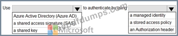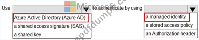 How should you configure access to the storage account for the data factory? To answer, select the appropriate options in the answer area.