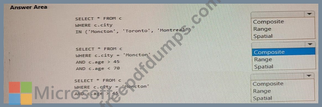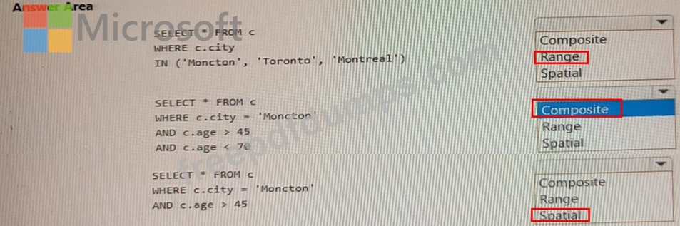 Which type of index should you use for each query? To answer, select the appropriate options in the answer area.