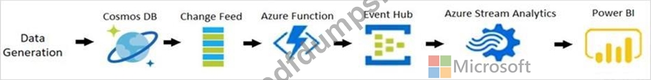 Solution: You create an Azure function that uses Azure Cosmos DB Core (SQL) API change feed as a trigger and Azure event hub as the output.