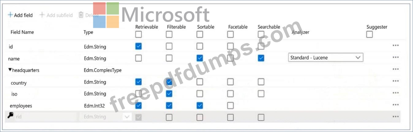 You configure Azure Cognitive Search to index a container in an Azure Cosmos DB Core (SQL) API account as shown in the following exhibit.