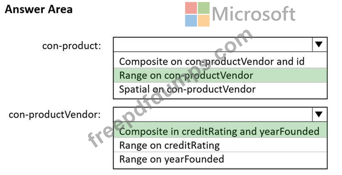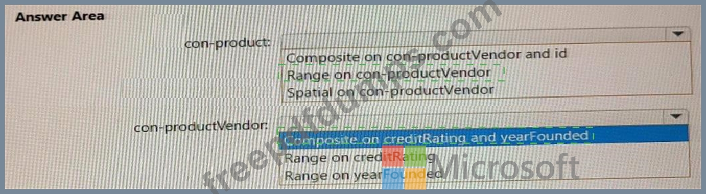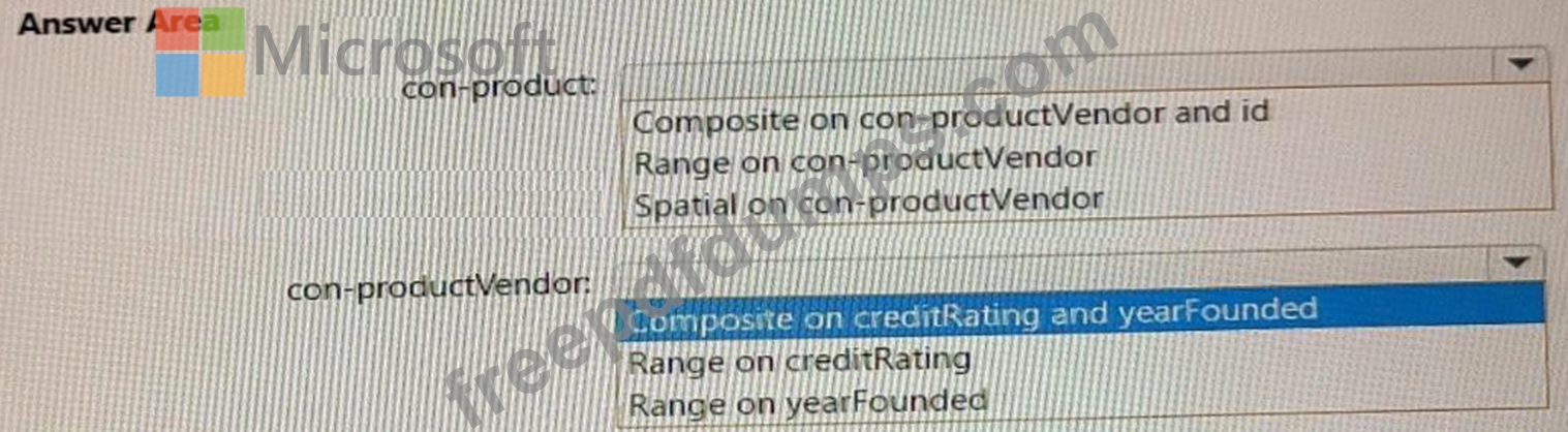 You need to recommend indexes for con-product and con-productVendor. The solution must meet the product catalog requirements and the business requirements.