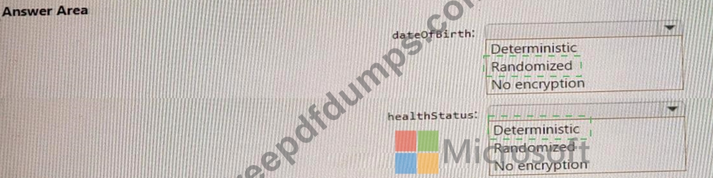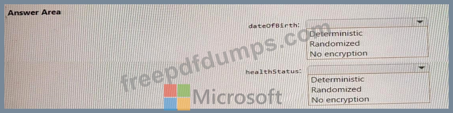 You need to protect the data stored in the container by using Always Encrypted. For each property, you must use the strongest type of encryption and ensure that queries execute properly.