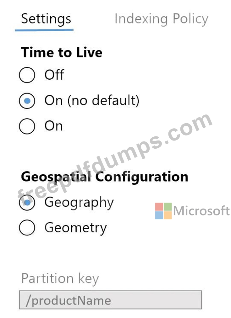 The settings for a container in an Azure Cosmos DB Core (SQL) API account are configured as shown in the following exhibit.