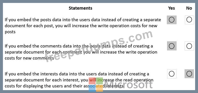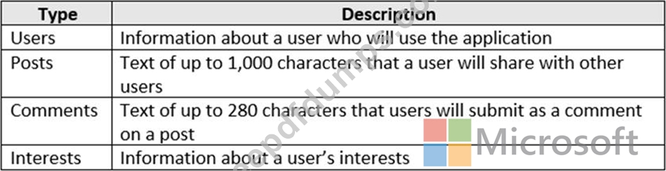 You are creating a database in an Azure Cosmos DB Core (SQL) API account. The database will be used by an application that will provide users with the ability to share online posts. Users will also be able to submit comments on other users' posts.