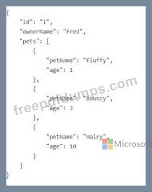 You have an Azure Cosmos DB container named owners. Each item in owners represents an owner and their pets. The following is a sample of the JSON