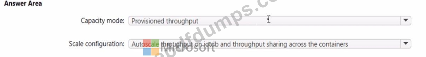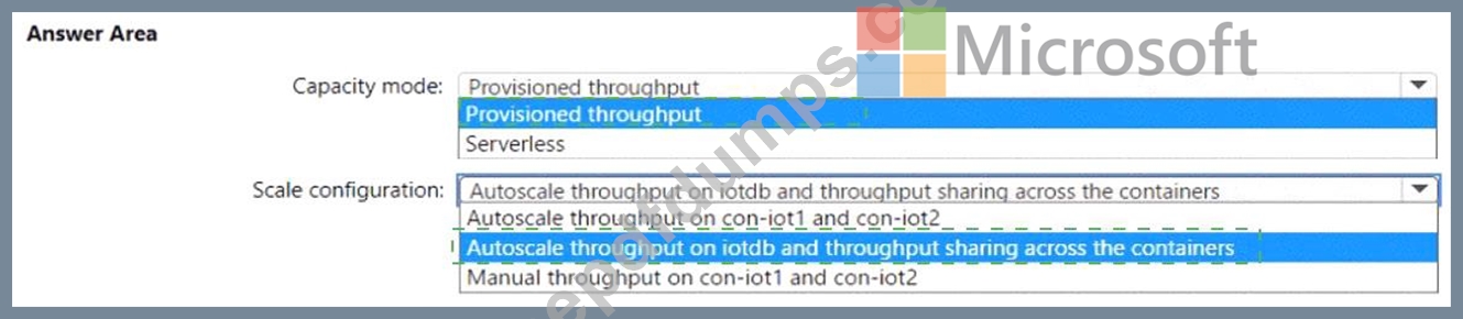 You need to select the capacity mode and scale configuration for account2 to support the planned changes and meet the business requirements. What should you select? To answer, select the appropriate options in the answer area. NOTE: Each correct selection is worth one point.