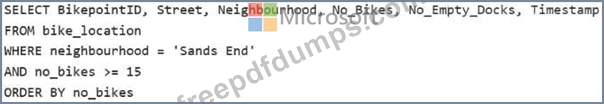 You need to apply transformation and filter logic to prepare the data for consumption. The solution must return data for a neighbourhood named Sands End when No_Bikes is at least 15. The results must be ordered by No_Bikes in ascending order.