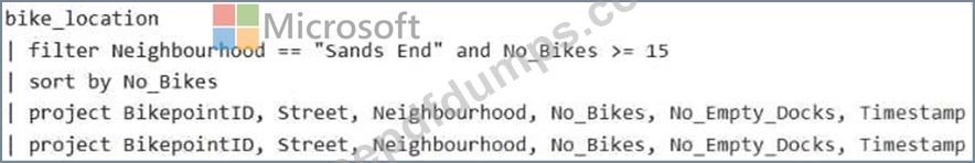 You have a Fabric eventstream that loads data into a table named Bike_Location in a KQL database. The table contains the following columns: