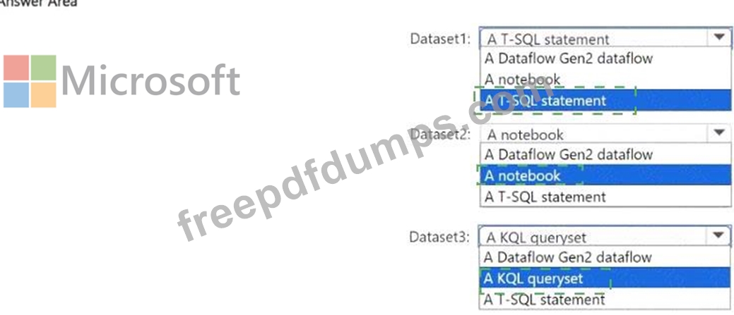 You need to identify which type of item to use for the datasets. The solution must minimize development effort and use built-in functionality, when possible. What should you identify for each dataset? To answer, select the appropriate options in the answer area.