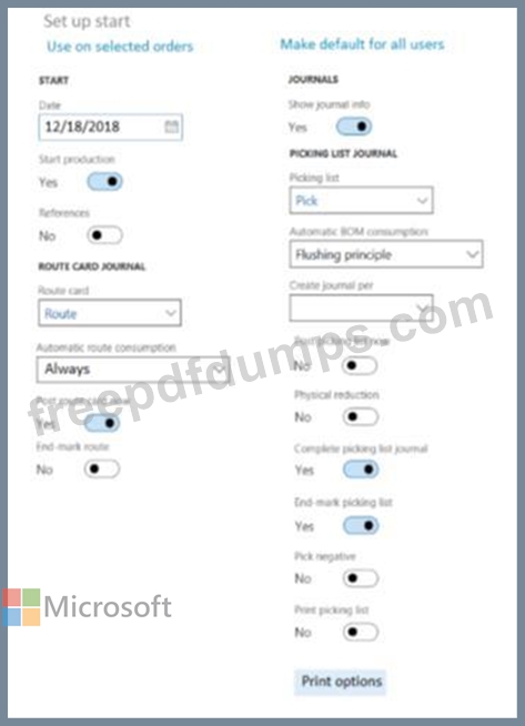 You have set up the default Start user options for all production orders as shown in the exhibit below.