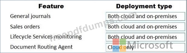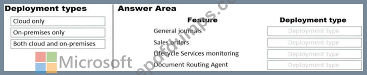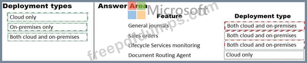 What should you recommend? To answer, drag the appropriate deployment types to the correct features. Each deployment type may be used once, more than once, or not at all. You may need to drag the split bar between panes or scroll to view content.