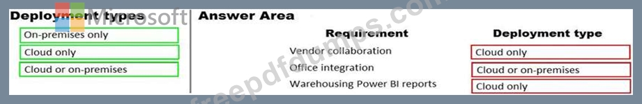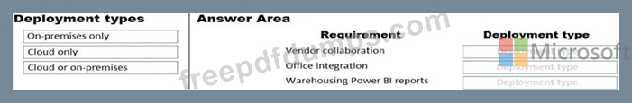 You need to recommend a cloud or on-premises solution based on the customer's business requirements. Which deployment type should you recommend? To answer, drag the appropriate deployment types to the correct requirements. Each deployment type may be used once, more than once, or not at all. You may need to drag the split bar between panes or scroll to view content.