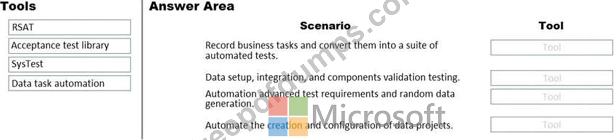 What should you recommend? To answer, drag the appropriate tools to the correct scenarios. Each tool may be used once, more than once, or not at all. You may need to drag the split bar between panes or scroll to view content.