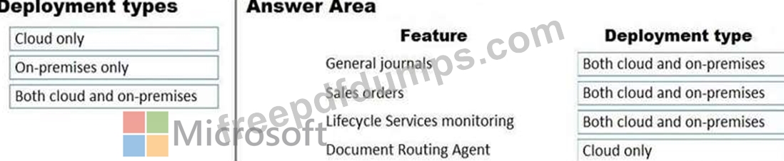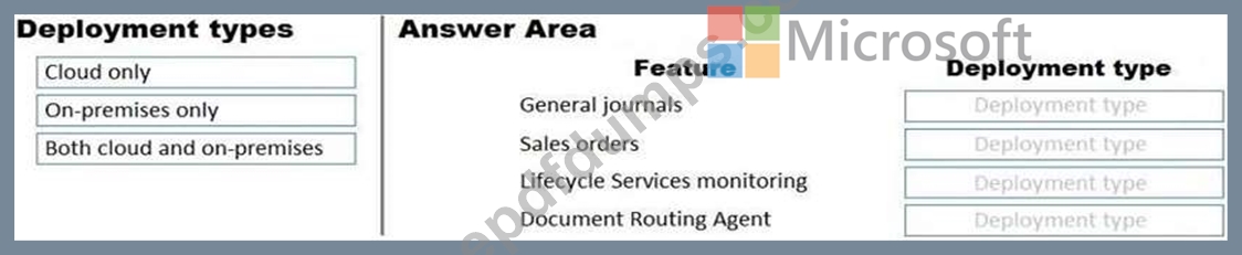 What should you recommend? To answer, drag the appropriate deployment types to the correct features. Each deployment type may be used once, more than once, or not at all. You may need to drag the split bar between panes or scroll to view content.