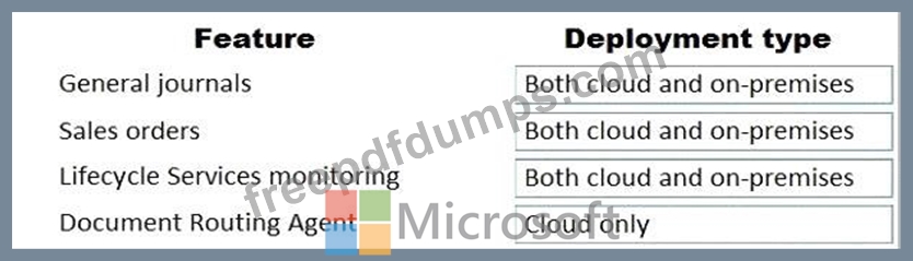 What should you recommend? To answer, drag the appropriate deployment types to the correct features. Each deployment type may be used once, more than once, or not at all. You may need to drag the split bar between panes or scroll to view content.