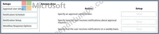 Which setup should you use? To answer, drag the appropriate setup to the correct actions. Each setup may be used once, more than once, or not at all. You may need to drag the split bar between panes or scroll to view content.