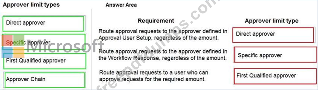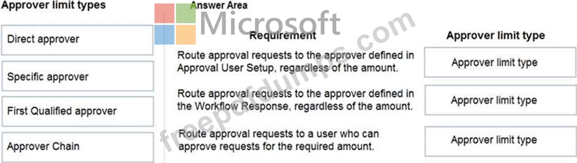 Which approver limit types should you use? To answer, drag the appropriate approver limit types to the correct requirements. Each approver limit type may be used once, or not at all. You may need to drag the split bar between panes or scroll to view content.