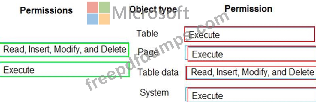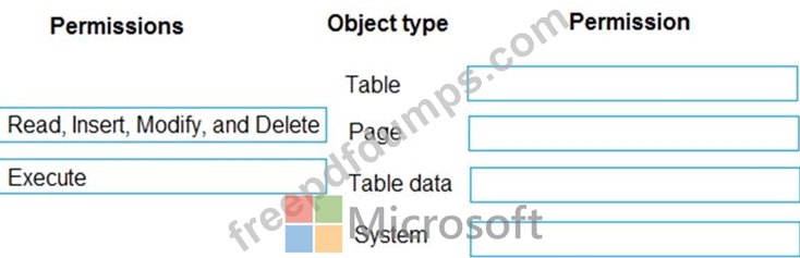 Which permission or set of permissions is allowed for each type of object? To answer, drag the appropriate permissions to the correct object types. Each permission set may be used once, more than once, or not at all. You may need to drag the split bar between panes or scroll to view content.