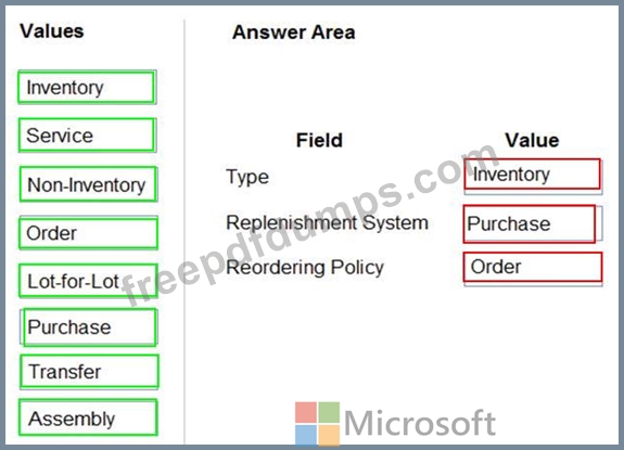 How should you configure each field? To answer, drag the appropriate values to the correct fields. Each value may be used once, more than once, or not at all. You may need to drag the split bar between panes or scroll to view content.