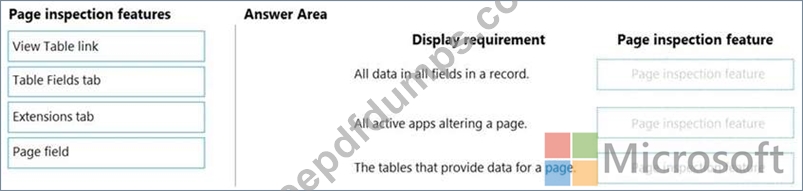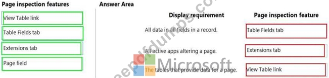 Which features should you use? To answer, drag the appropriate page inspection features to the correct display requirements. Each page inspection feature may be used once, more than once, or not at all. You may need to drag the split bar between panes or scroll to view content.