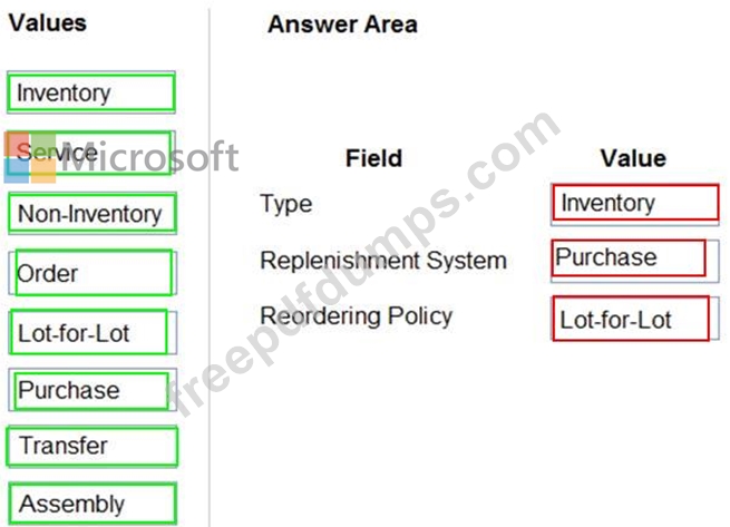 How should you configure each field? To answer, drag the appropriate values to the correct fields. Each value may be used once, more than once, or not at all. You may need to drag the split bar between panes or scroll to view content.