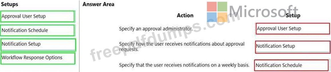 Which setup should you use? To answer, drag the appropriate setup to the correct actions. Each setup may be used once, more than once, or not at all. You may need to drag the split bar between panes or scroll to view content.