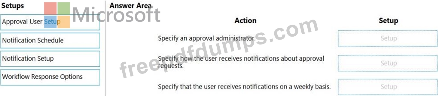 Which setup should you use? To answer, drag the appropriate setup to the correct actions. Each setup may be used once, more than once, or not at all. You may need to drag the split bar between panes or scroll to view content.