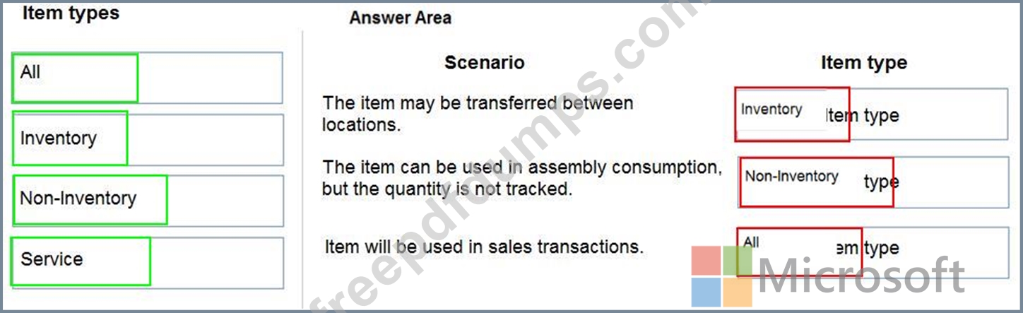 Which item types should you use? To answer, drag the appropriate item types to the correct scenarios. Each item type may be used once, more than once, or not at all. You may need to drag the split bar between panes or scroll to view content.