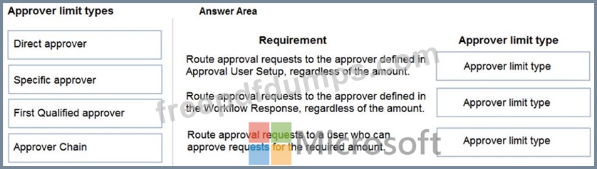 Which approver limit types should you use? To answer, drag the appropriate approver limit types to the correct requirements. Each approver limit type may be used once, or not at all. You may need to drag the split bar between panes or scroll to view content.