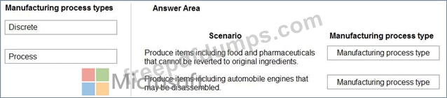 What should you recommend? To answer, drag the appropriate manufacturing process types to the correct scenarios. Each manufacturing process type may be used once, more than once, or not at all. You may need to drag the split bar between panes or scroll to view content.