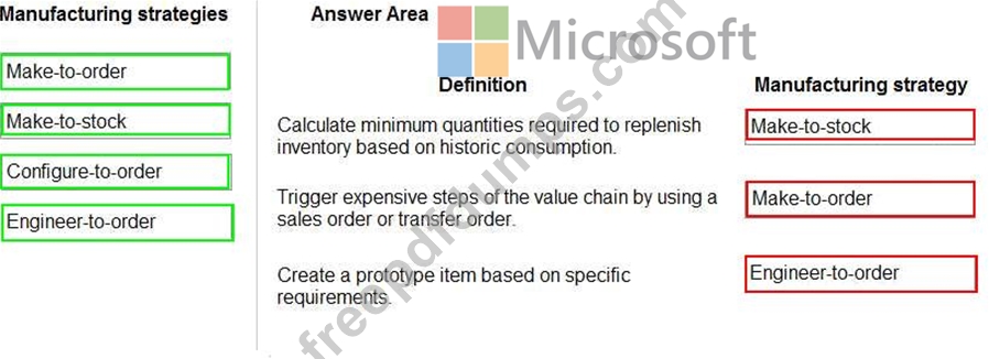 A company plans to implement Dynamics 365 Supply Chain Management. Match each manufacturing strategy to its definition.